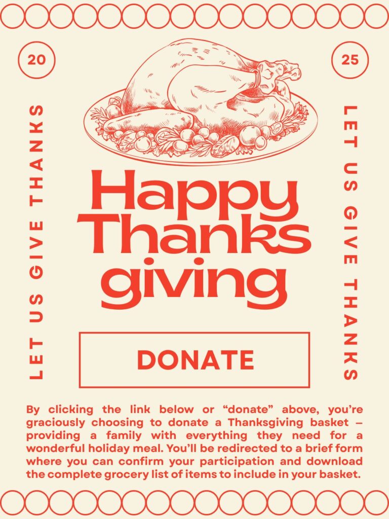 By clicking the link below or “donate” above, you’re graciously choosing to donate a Thanksgiving basket — providing a family with everything they need for a wonderful holiday meal. You’ll be redirected to a brief form where you can confirm your participation and download the complete grocery list of items to include in your basket. LINK: https://form.jotform.com/PLPOA/TG2025donate
