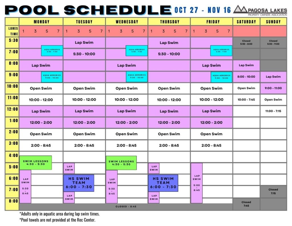 The Aquatics Facility closes 15 minutes prior to the building closure. The pool schedule is subject to change due to ongoing programs.