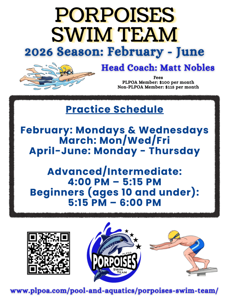 The PLPOA Porpoises is a club swim team that is managed by the PLPOA Recreation Center. Certified coaches are hired for this team. PLPOA members, as well as non-members are allowed to join the team. Swimmers must be 8 – 17 and able to swim a length of the pool. This team practices and travels to meets in the Spring and Summer. Club members pay dues monthly.