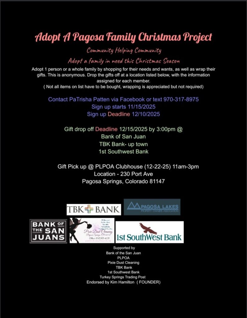 Just a reminder for those owners who have boats stored at the common boat storage areas at Hatcher Lake, Lake Pagosa and Lake Forest; those boats needed to be removed for the winter by November 1st. They can go back out next spring after April 1st